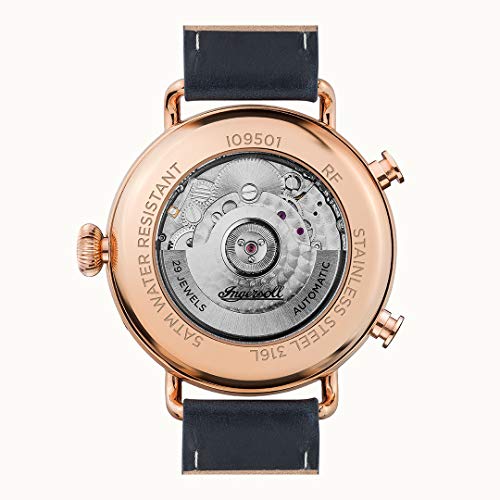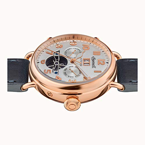 Ingersoll 1892 Automatic Gents Watch mit rosegoldenem Edelstahlgehäuse, blauem Horween-Lederarmband, automatischem Uhrwerk, Leuchtzeigern, Datums-, Tages- und Monatsanzeigen sowie 50 m Wasserdichtigkeit.