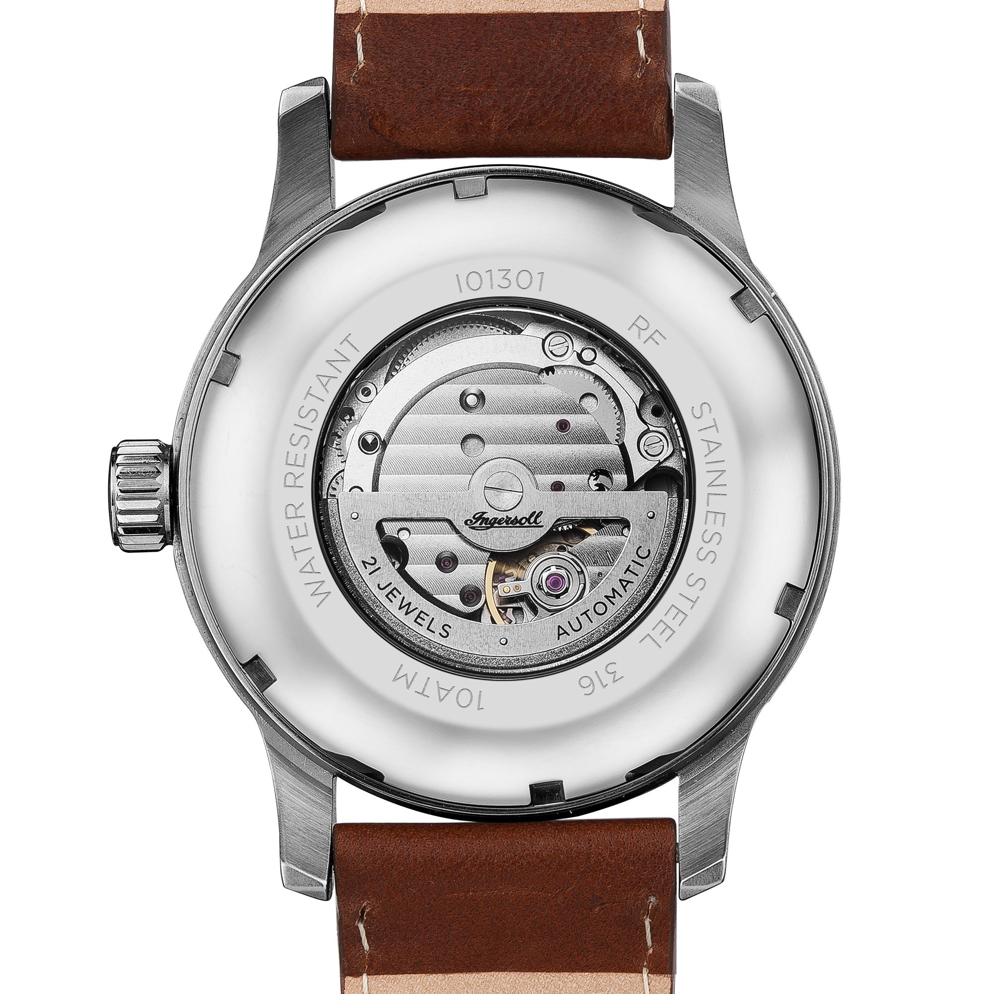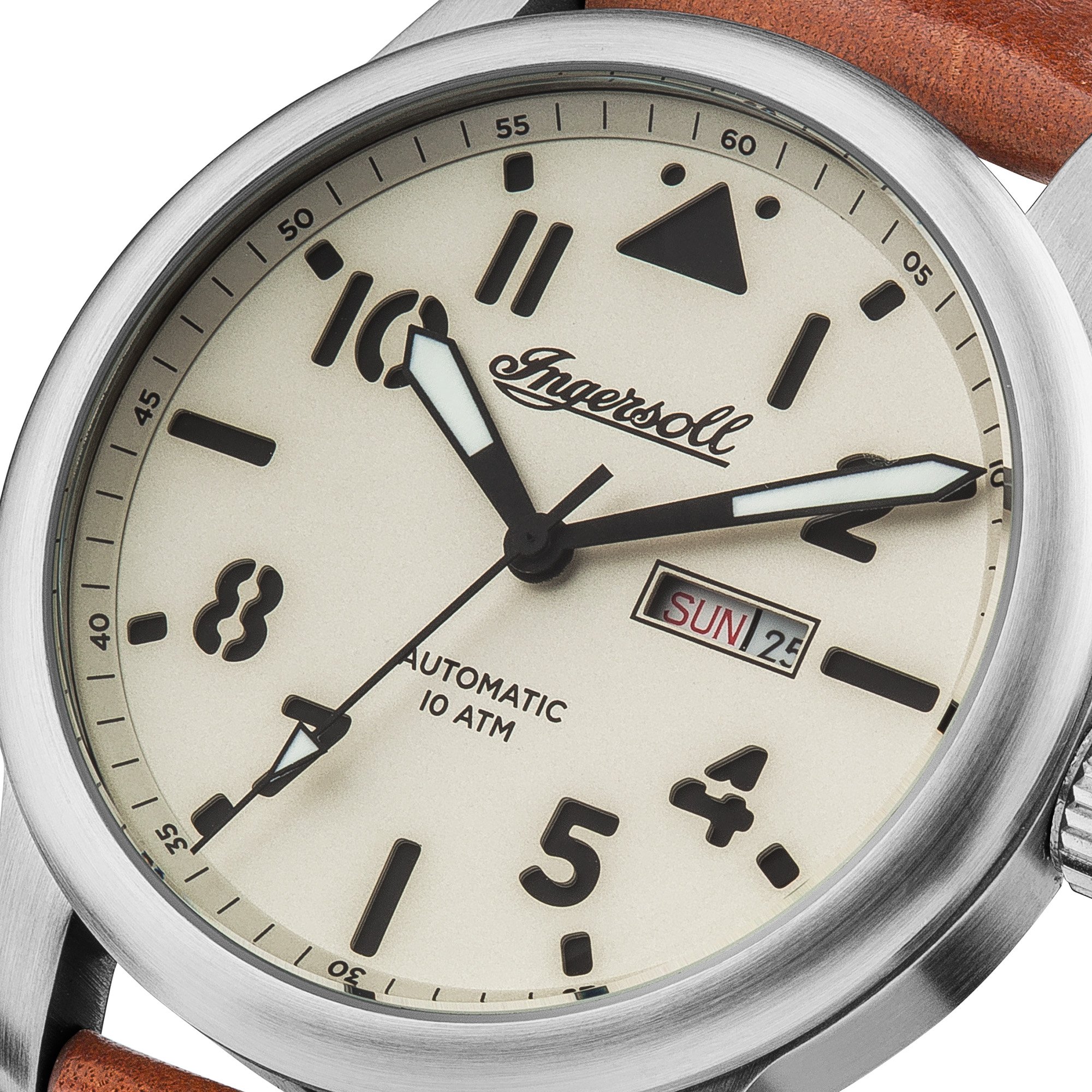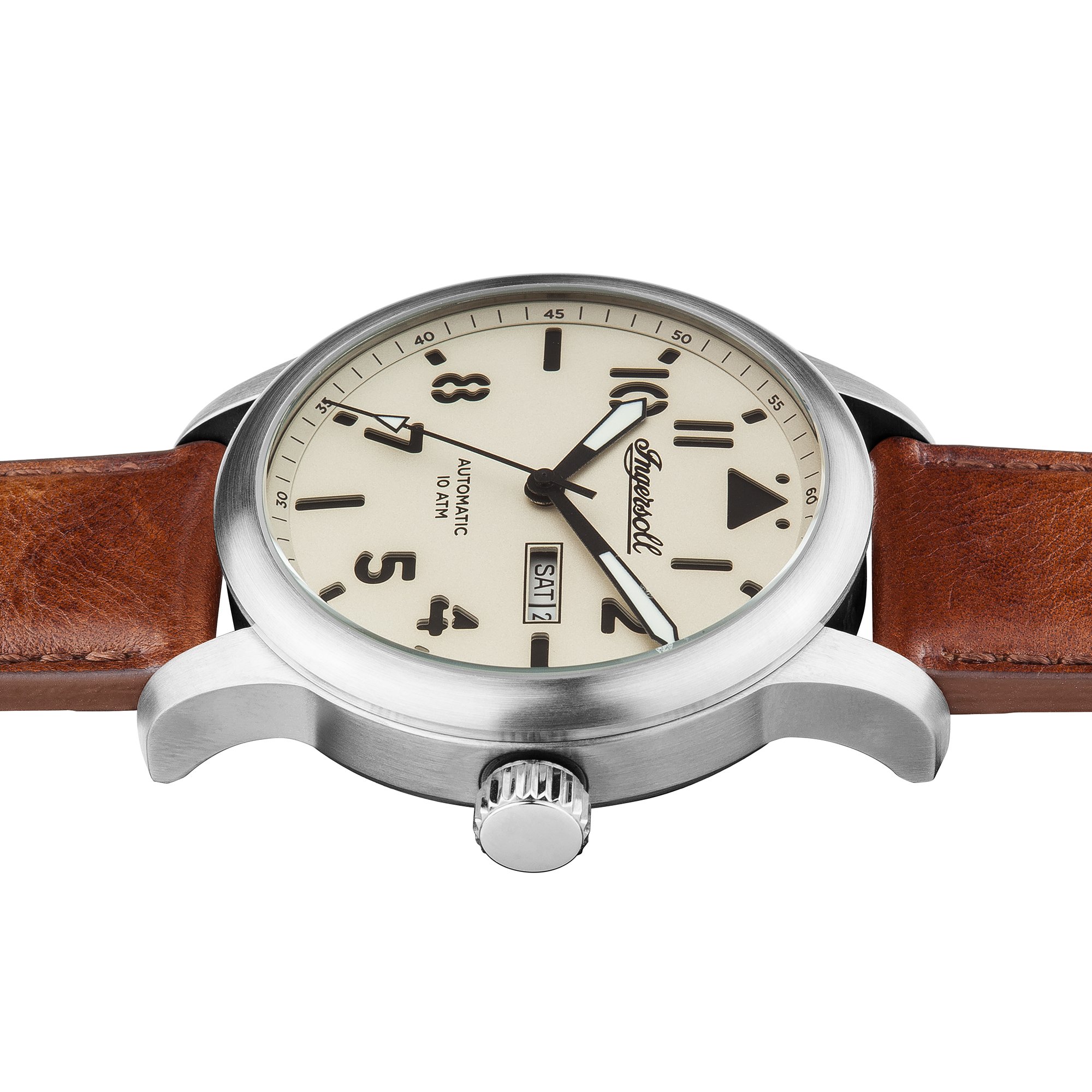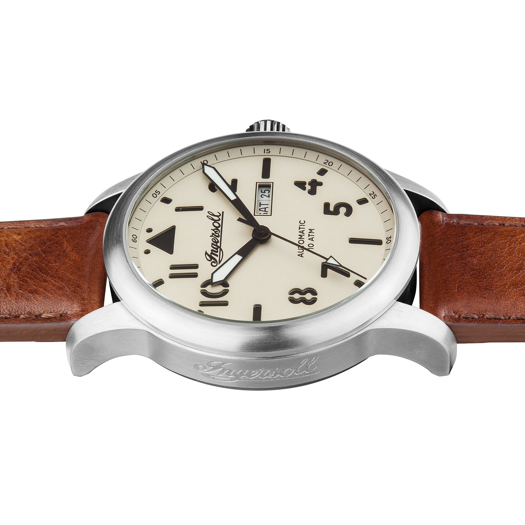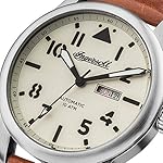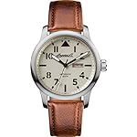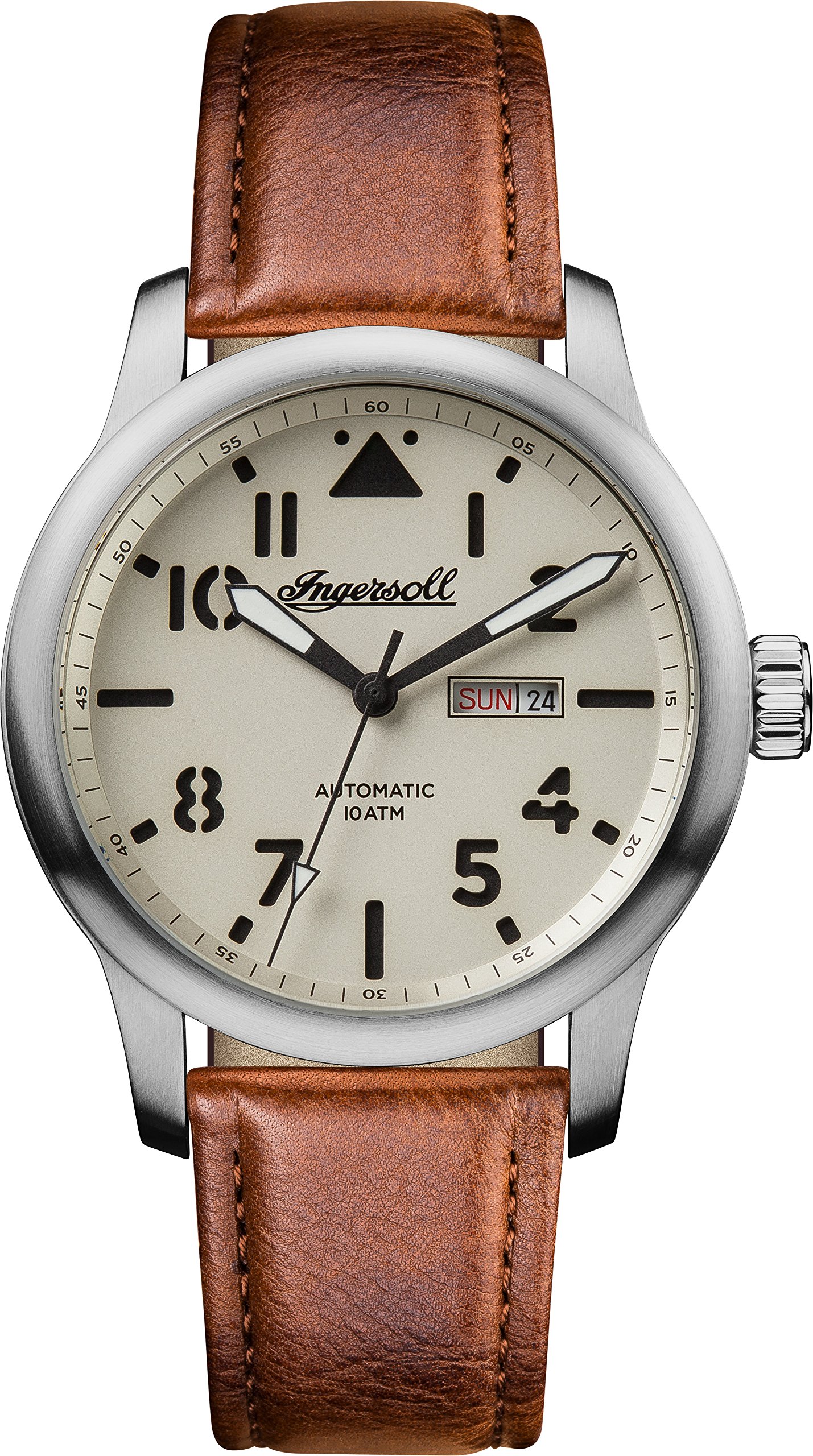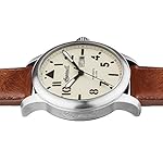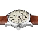 Edelstahl-Gehäuse, verschraubter Glasboden, geriffelte Krone, Front unter anderem Gehäuseboden jedweder Mineralglas, wasserdicht solange bis 10 cash, Weite 47,5 mm, Berg 16 mm, Armband jedweder genarbtem braunen Leder, matte Dornschließe, mechanisches Uhrwerk via automatischem Darbietung, Kleinanzeige von Datum unter anderem Wochentag, crèmefarbenes Zifferblatt, schwarze Deckname unter anderem Zahlen, Leuchtzeiger, zentraler Sekundenzeiger