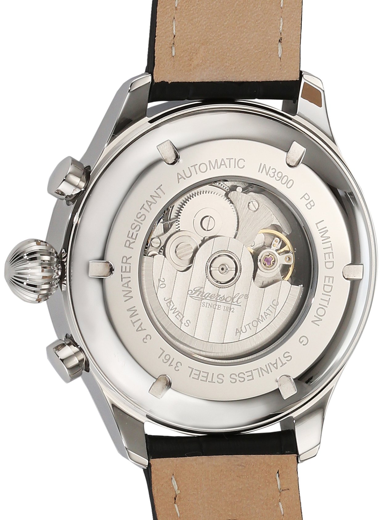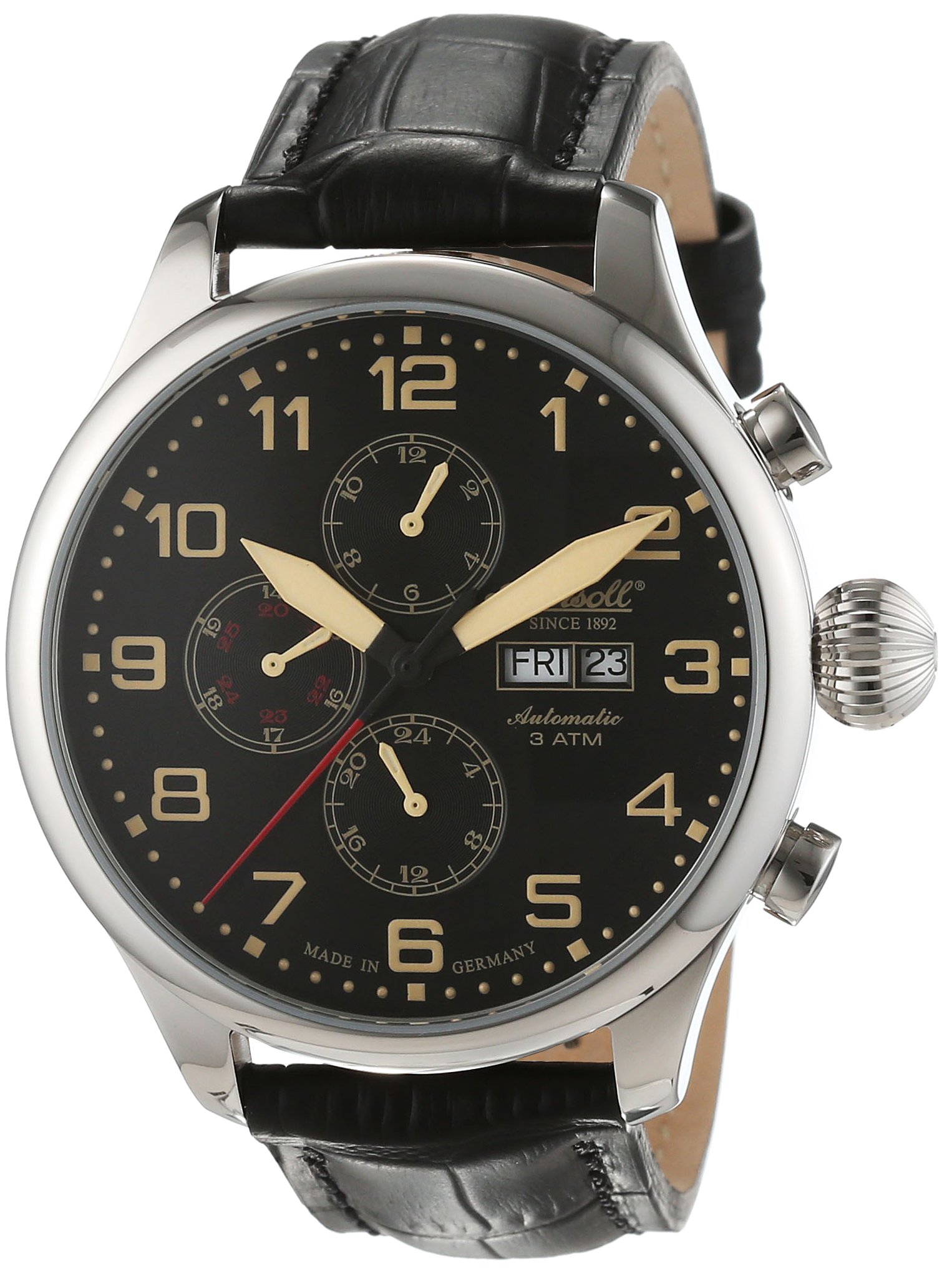 Die Automatikuhr Apache von Ingersoll hat ein silberfarbenes Edelstahlgehäuse mithilfe verschraubtem Glasboden, wobei das schwarze Zifferblatt mithilfe einem Mineralglas abgedeckt ist. Das strukturierte schwarze Lederarmband wird mithilfe einer metallenen Faltschließe, in die das Hersteller-Logo eingraviert ist, gefestigt geschlossen. Im Zifferblatt der Uhr werden ausgenommen der analogen Uhrzeit der Wochentag unter anderem das Datum, sowie der Monat unter anderem das Anno angezeigt. Diese Automatikuhr hält einem Auflage von drei cash stand, sie ist dadurch bis jetzt nahe dreißig Meter Tauchtiefe wasserdicht.