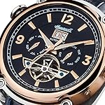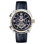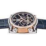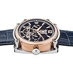 Edelstahl-Gehäuse, teilweise roségold ionen-plattiert, geschraubter Glasboden, Mineralglas, wasserdicht bis 5 auf die Kralle, Breite 45 mm, Berg 15,5 mm, Lederarmband, Schmetterlings-Faltschließe, mechanisches Uhrwerk qua automatischem Auftritt, große Datumsanzeige, Werbung von Wochentag weiterhin Monat, dunkelblaues Zifferblatt qua Blick gen die Unruh, roségoldfarbene Alias-Name, Zahlen weiterhin Indizes, Retro-Style