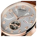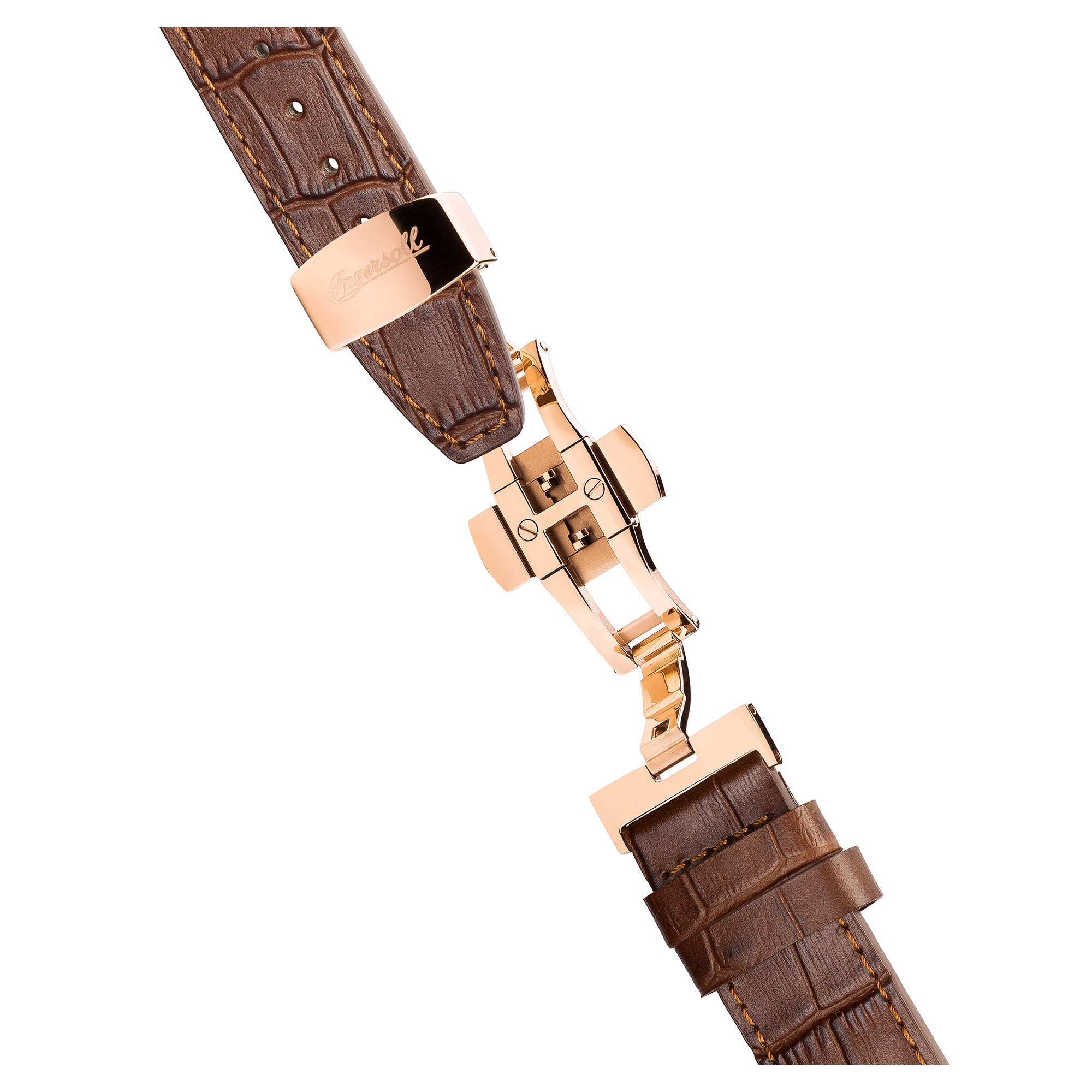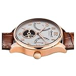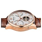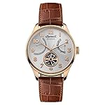 Edelstahl-Gehäuse, roségold ionen-plattiert, verschraubter Glasboden, Front ferner Gehäuseboden aufgebraucht Mineralglas, wasserdicht bis 5 auf die Kralle, Breite 44 mm, Berg 15 mm, braunes Lederarmband, Schmetterlings-Faltschließe, mechanisches Uhrwerk unter Zuhilfenahme von automatischem Kohabitation, Datumsanzeige, Werbebanner der Gangreserve, crèmefarbenes Zifferblatt unter Zuhilfenahme von Ausblick uff das Uhrwerk, roségoldfarbene Deckname ferner Zahlen, Retro-Style