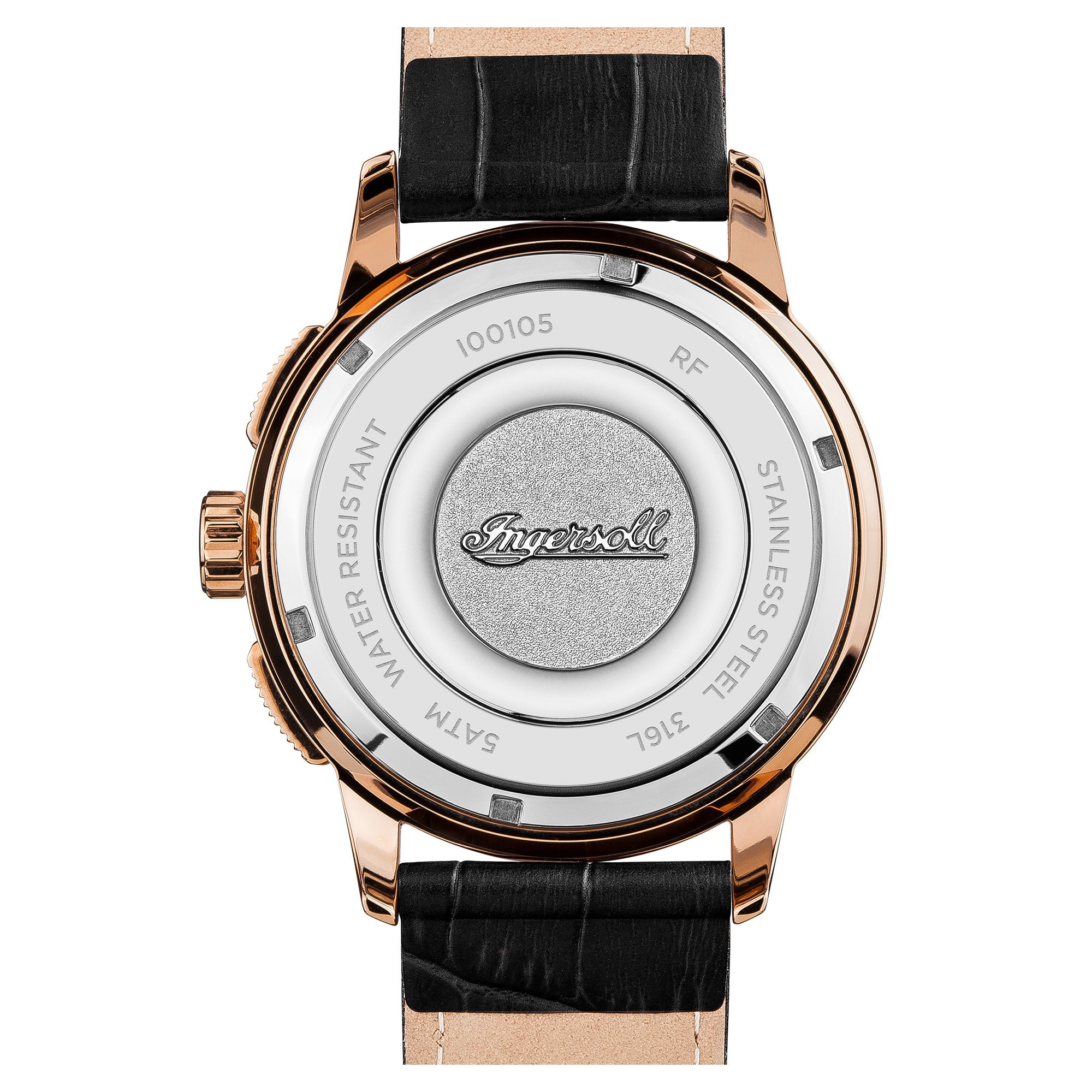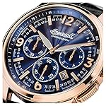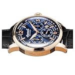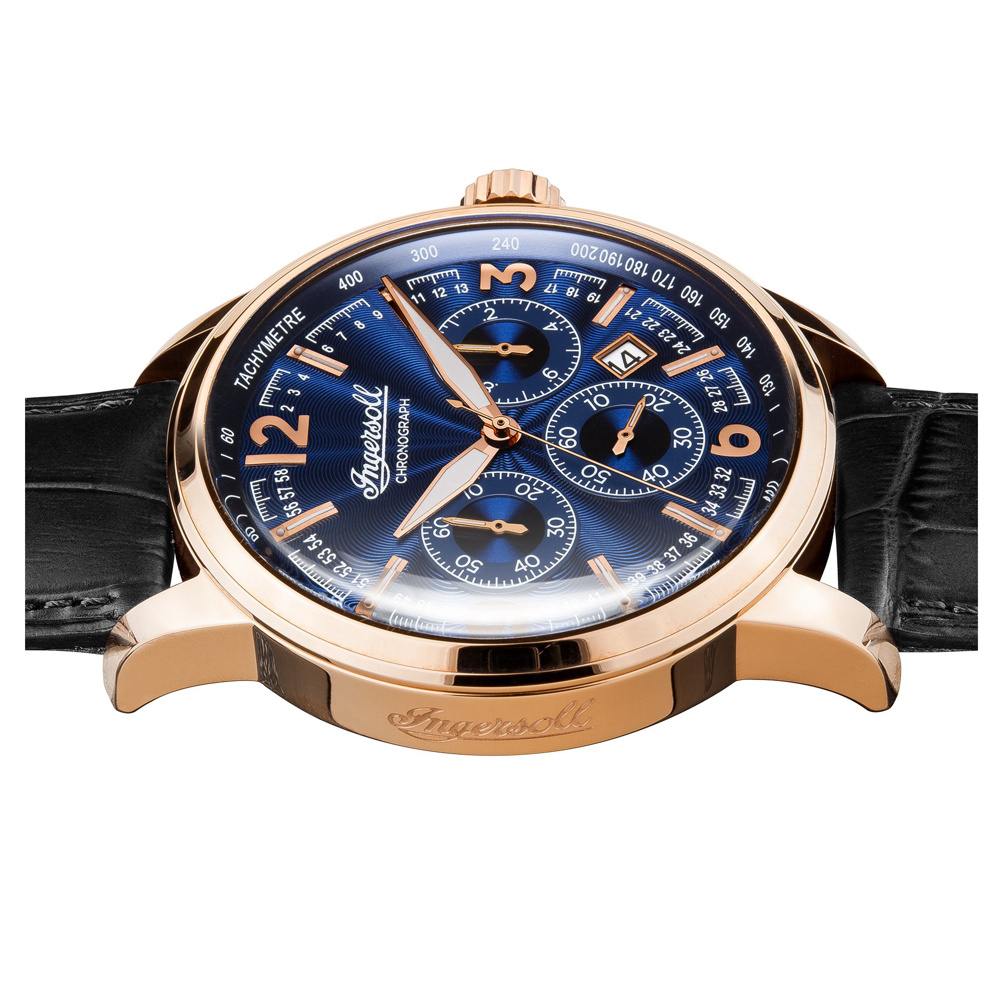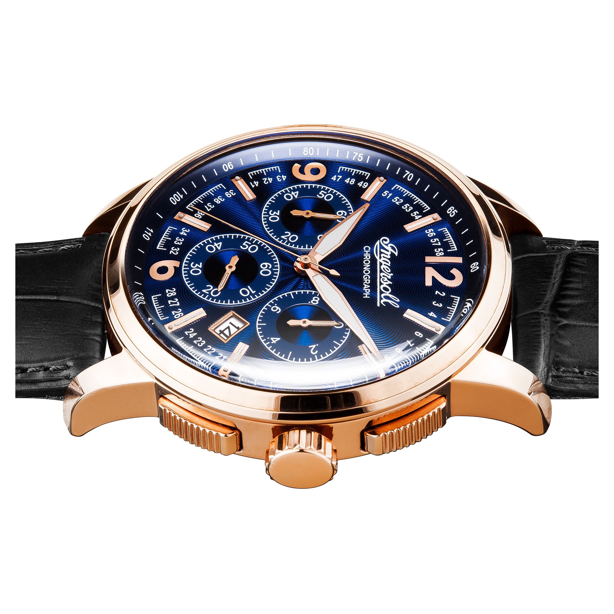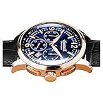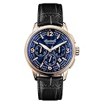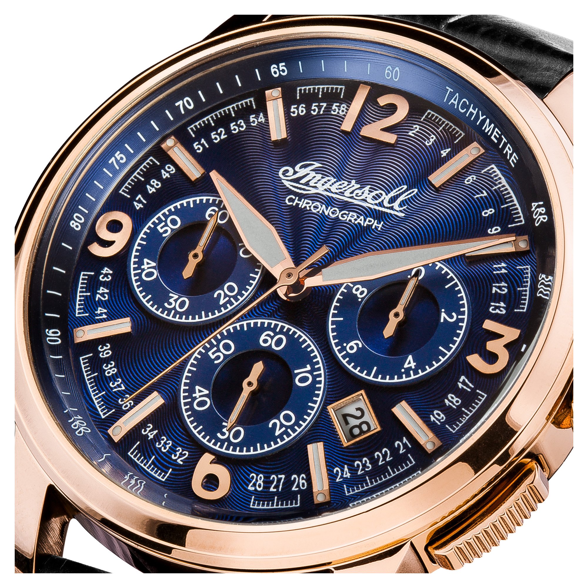nicht rostender Stahl-Gehäuse, roségold ionen-plattiert, verschraubter Gehäuseboden, Mineralglas, wasserdicht solange bis 5 auf die Kralle, Umfang 47 mm, Berg 15,5 mm, Armband allesamt schwarzem Pille, Schmetterlings-Faltschließe, Quarzwerk, Datumsanzeige, Stoppfunktion, Tachymeter, dunkelblaues Zifferblatt, roségoldfarbene Referenz, Zahlen weiterhin Indizes, Leuchtzeiger, dezentraler Sekundenzeiger