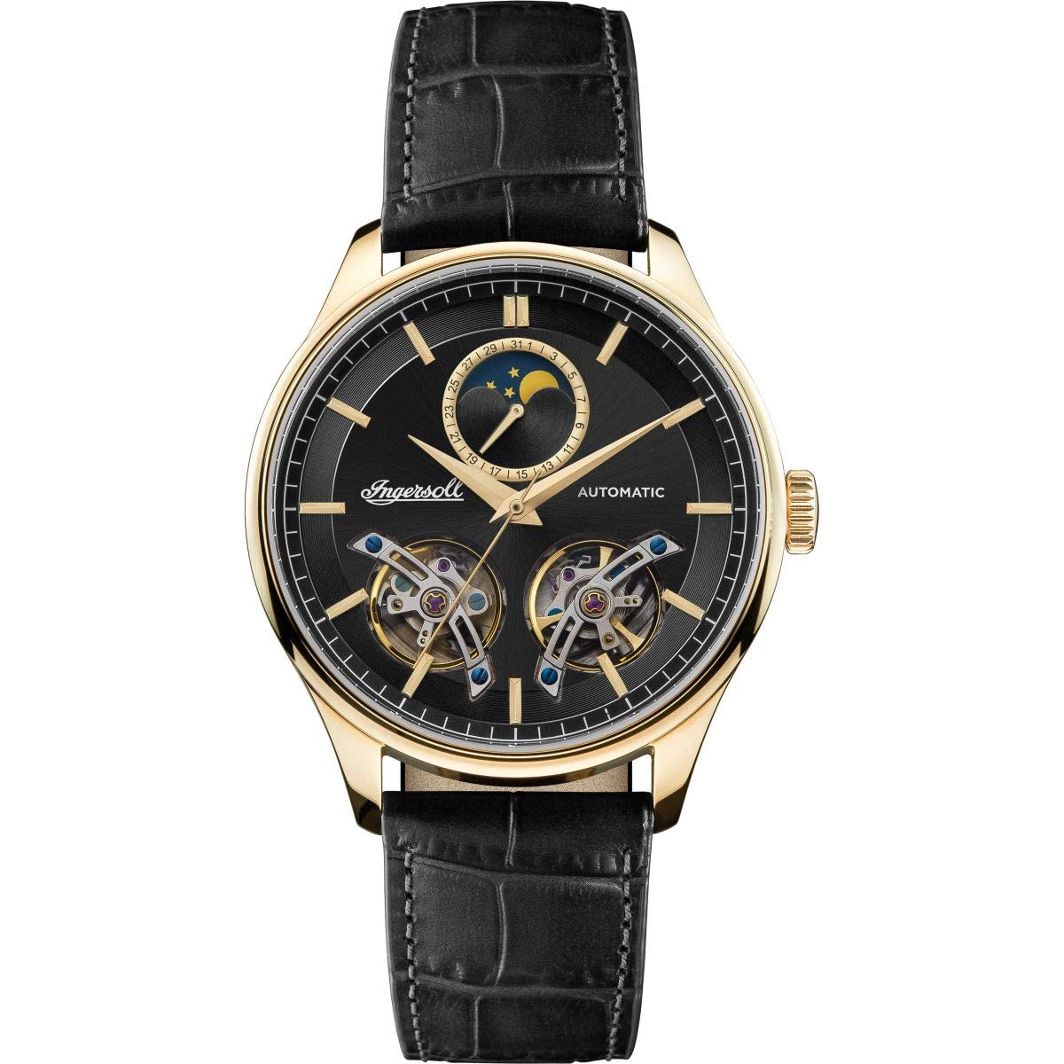 Ingersoll herren uhr. Golden vergoldet stahl gehäuse Negrid zifferblatt. Automatik bewegung. Wasserdichtigkeitszertifizierung 50 meter.